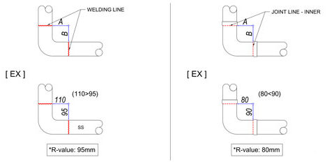 - Steel or Stainless Steel Pipe: please measure the welding lines, horizontal and vertical length, the smaller length is the R-value of 90 degree elbow cover.