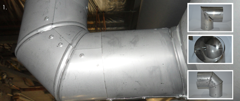 There are still many poorly designed elbow systems in the market today. Images 1, 2, 3 and 4 are classic examples where riveting and screws are still commonly being used to fabricate elbows. Not only does this waste time and labour, the integrity of the insulation is tarnished.